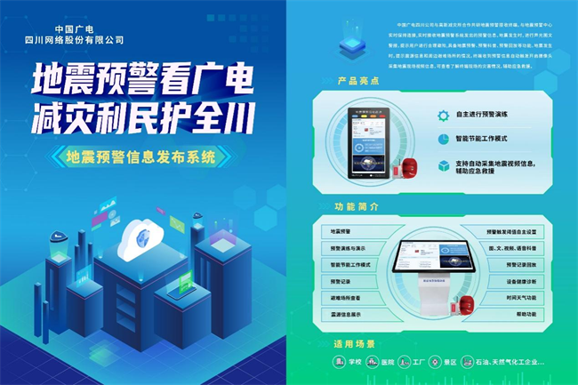 “电视地震预警服务”是中国广电四川公司推出的公益服务,通过电视弹窗在地震发生时及时推送预警信息,提醒地震波到达的倒计时和预估强度,为群众争取黄金避险时间,有效减少伤亡与损失。目前电视地震预警已经覆盖四川21个市州所有183个区市县,四川也成为全国首个实现广电电视地震预警县级全覆盖的省份。